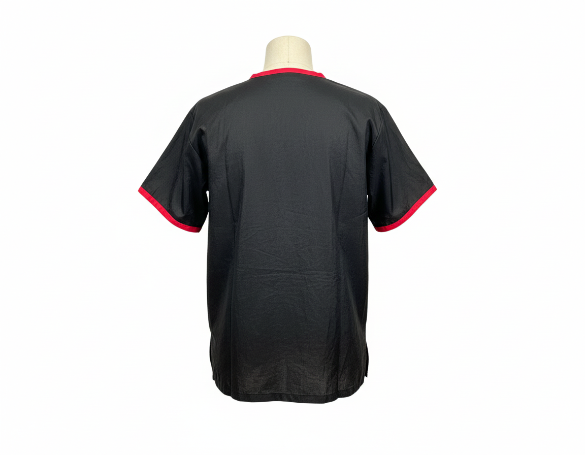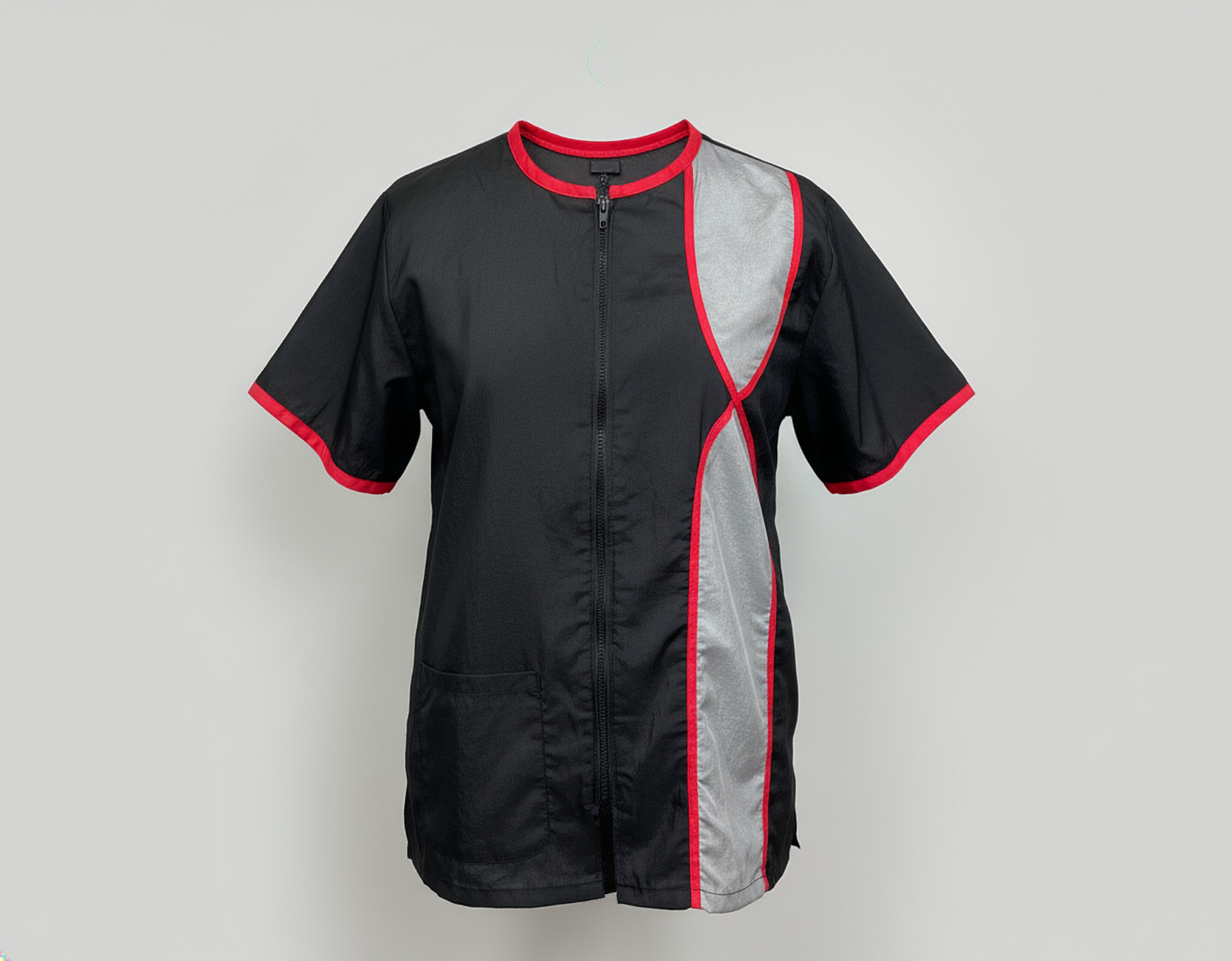 Stay clean and professional with this men’s zip-front stylist top made from 100% nylon with a water and hair repellent finish. Designed for barbers, groomers, and salon professionals, it features a lightweight, breathable fit, short sleeves, and a modern color-block design with bold red trim. Durable, easy to wear, and perfect for busy workdays behind the chair.