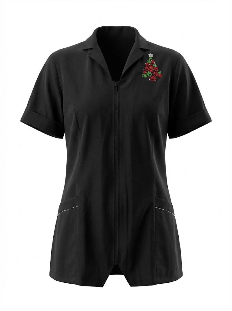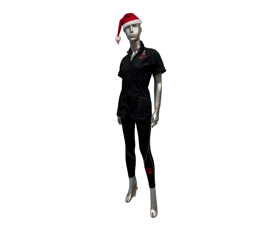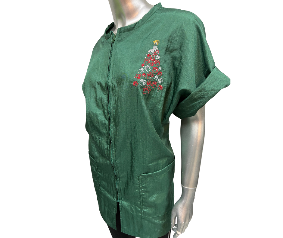 Add a playful holiday touch to your workwear with our Embroidered Paw Print Tree Motif! This unique design blends holiday spirit with your love for pets, making it a customer favorite for groomers and stylists alike.