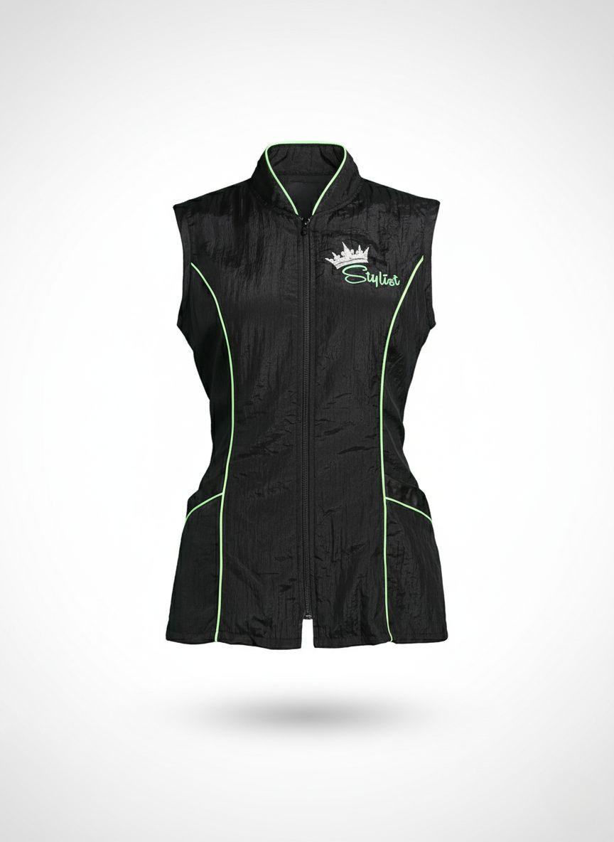 Piped Princess Air Vest – XS, S, M, L, XL, 2XL, 3XL, 5XL. It is detailed with contrast piping at the princess seams, pockets, and neckline. Shown here in Black with Lime. Decorations such as Coated Fabric, Rhinestones, Embroidery, & Screen-print are sold separately unless otherwise noted.