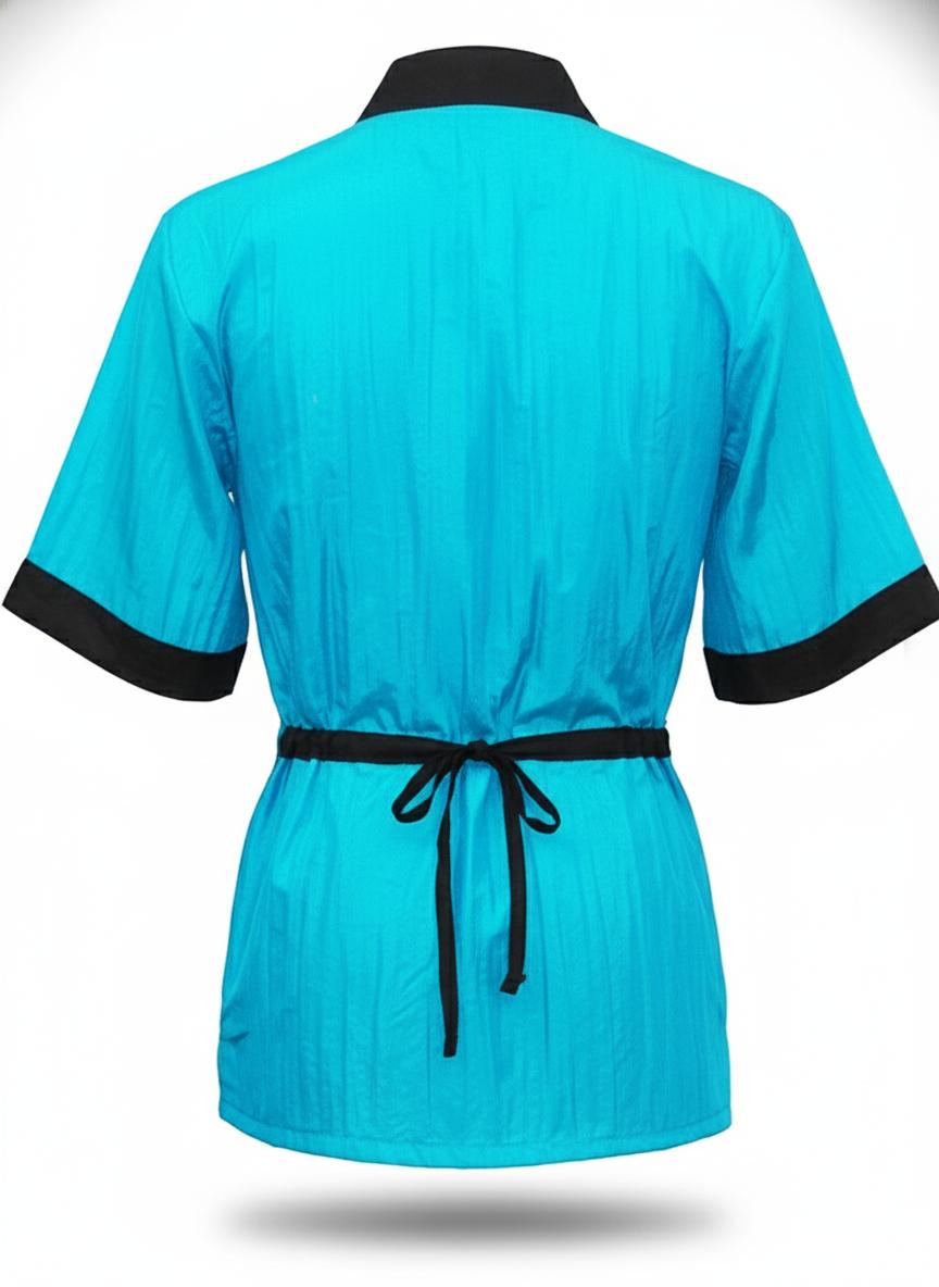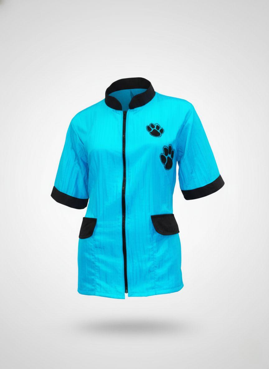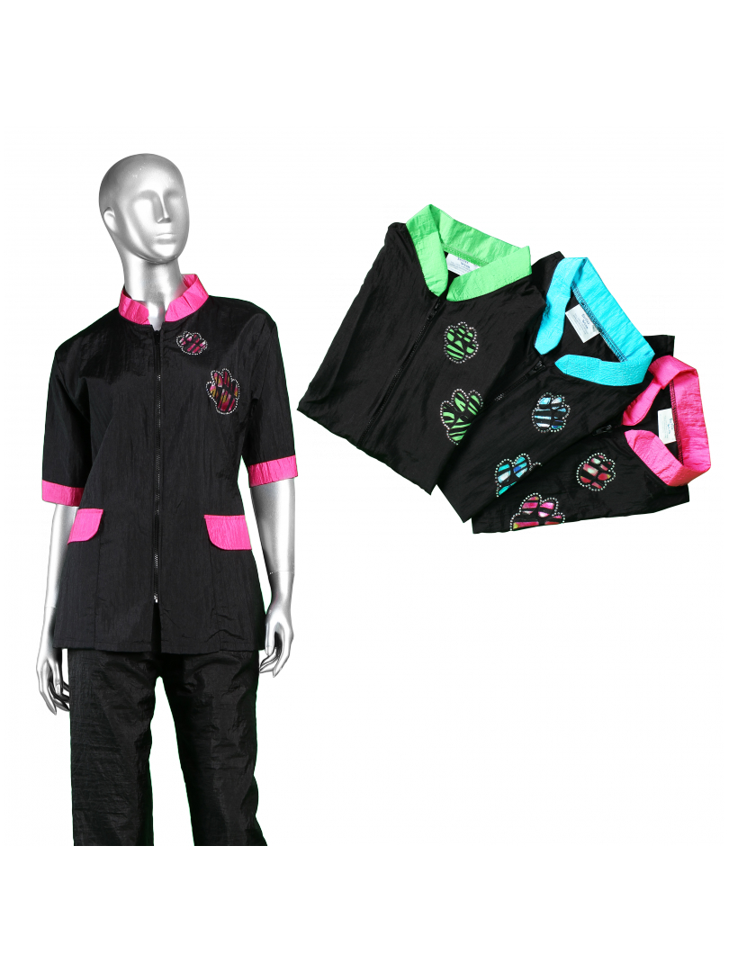 Roxy Top – S, M, L, XL, 2XL, 3XL. This short sleeve jacket comes with front zipper, two side front pockets, side vents. It has contrasting details such as collar, lower sleeves, waist ties, pocket flaps and double paw on the upper left chest which is also outlined in clear rhinestones.